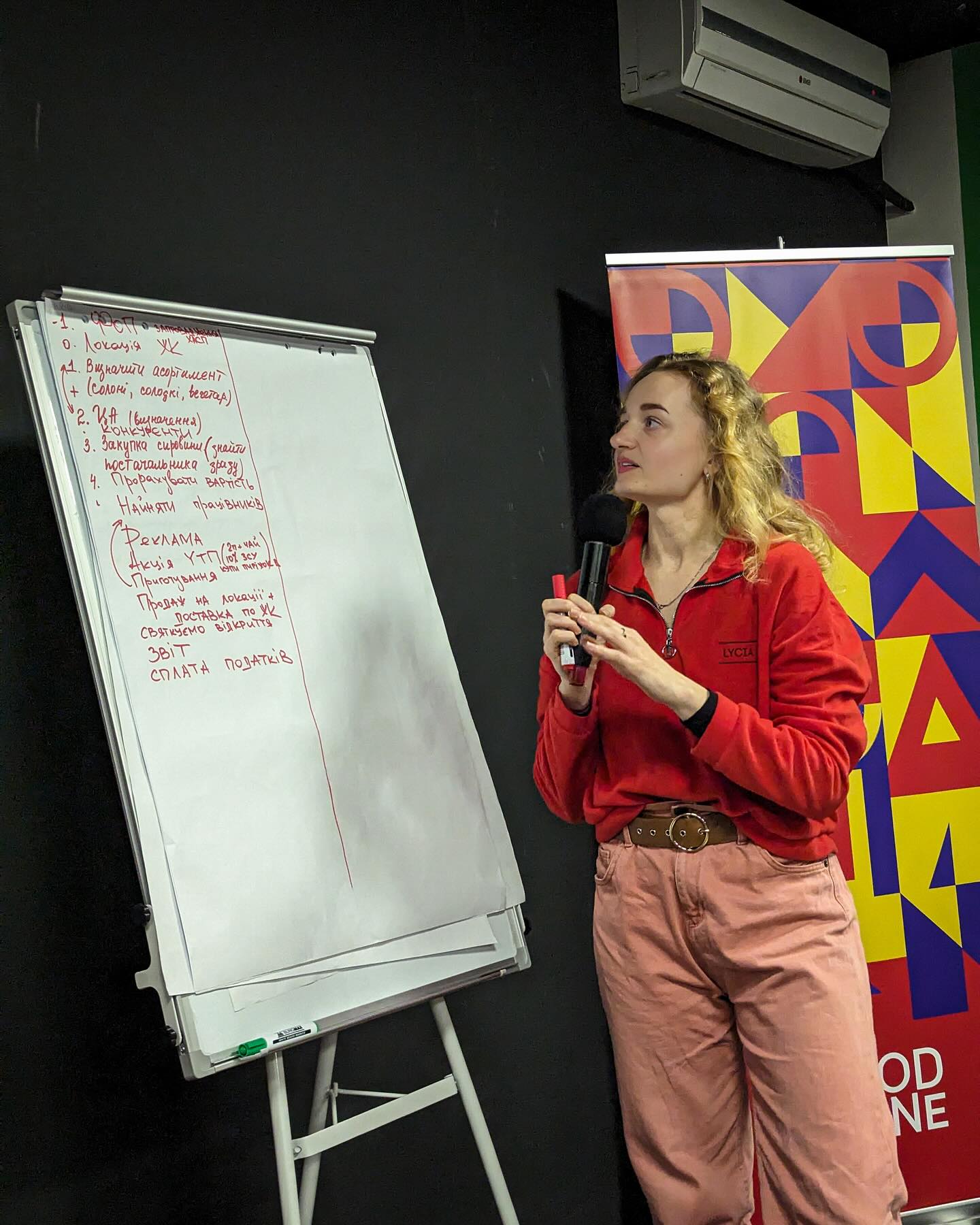 У перший день учасниці встигли не тільки познайомитися одна з одною та поняттями базової економіки, а й поділитися своїми емоціями, розібратися із тим, які ідеї для бізнесу їх приваблюють та… зліпили пиріжок. Точніше узяли участь в інтерактивній бізнес-грі, під час якої прописували процес приготування пиріжка від рішення його створити до сплати податків за пиріжок ![]()